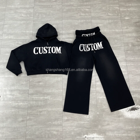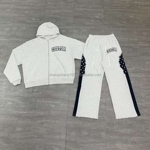 מותאם אישית כפול מכנסי מותן מסך rhinestone כבד הדפס פליק רקמה טלאי חומצה שמש דהוי סט קפוצ 'ון